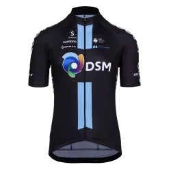 With the Team DSM Replica short-sleeve jersey, you’ll be just as stylish on the bike as the Team DSM riders. This cycling jersey adapts to the shape of your body, offering the perfect mix of aerodynamics and comfort. Thanks to the elastic waistband with silicone gripper, everything stays perfectly in place throughout the whole ride, even when riding in an aerodynamic position. Furthermore, the 4-way stretch gives you extra freedom of movement. The clean-cut sleeves and long YKK zipper add to the comfort and convenience of this cycling jersey. On the back, you have enough space to store your stuff in the three easily accessible pockets.